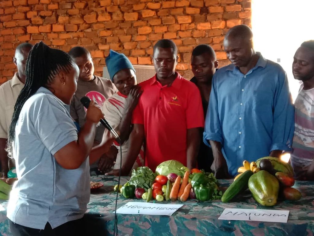 ADP Mbozi Project Nutritionist Miss, Martha Mchaki giving a demonstration to a group of community members on different food groups during Commemoration of World Food